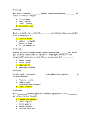 Este documento presenta 40 problemas de aptitud con frases incompletas y opciones de respuesta. El objetivo es escoger la alternativa que complete mejor cada frase. Se da un tiempo de 15 minutos para resolverlos. Cada problema presenta una frase incompleta seguida de varias opciones para completarla.