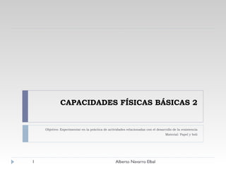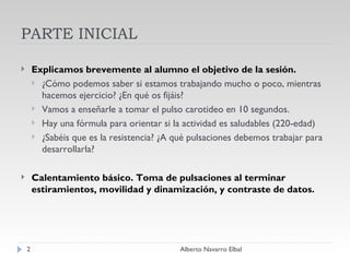 El documento describe una sesión para desarrollar la resistencia física en niños. La sesión incluye una explicación del objetivo, toma de pulso antes y después de ejercicios, y varias actividades como carreras, relevos y caminatas para elevar la frecuencia cardíaca de forma segura. El documento concluye revisando si se logró el objetivo y anticipando la tarea para la próxima sesión.
