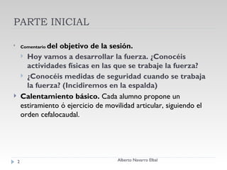 El documento describe una sesión de desarrollo de fuerza física que incluye varias actividades. Comienza con un calentamiento y luego presenta tres actividades principales: empujar a otros fuera de un círculo dibujado, dar la vuelta a un compañero acostado, y transportar a un compañero acostado en una colchoneta. Finaliza con estiramientos, preguntas sobre sensaciones y fuerza, y anticipando la tarea siguiente.