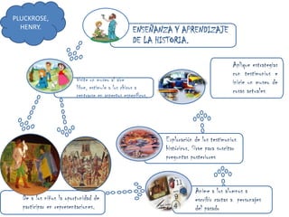Este documento discute diferentes estrategias para enseñar historia a niños en educación infantil y primaria. Sugiere que el uso de fuentes como objetos y fotos estimula la observación, preguntas y pensamiento crítico de los niños sobre el pasado. También recomienda visitas a museos, trabajos en equipo para aprender más sobre lo visitado, y la participación de los padres compartiendo historias familiares o jugando.