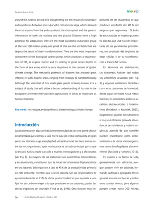 Las diatomeas son algas unicelulares microscópicas que producen el 20% del oxígeno en la Tierra. Se originaron hace aproximadamente 200 millones de años a través de la endosimbiosis secundaria entre una célula eucariótica y un alga. Las diatomeas son extremadamente diversas y abundantes, constituyendo casi la mitad de la biomasa fitoplanctónica en los océanos. Desempeñan un papel fundamental en el ciclo del carbono y el silicio a través de la fijación de carbono y