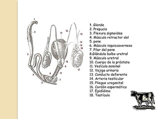 Este documento resume la anatomía reproductiva de los machos de varias especies importantes como el bovino, porcino, ovino y equino. Explica la estructura y función de los órganos reproductivos masculinos como los testículos, el escroto, el pene y la uretra. También describe el desarrollo embrionario del sistema reproductor y los procesos de reproducción a nivel celular en los testículos.