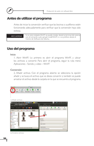 Este documento explica cómo convertir archivos de audio de un formato a otro usando el programa WinFF en Linux. Primero se debe agregar los archivos de audio a una carpeta y darles nombres sin caracteres especiales. Luego, se abre WinFF, se añaden los archivos seleccionando la opción de conversión deseada y la carpeta de destino, y finalmente se presiona el botón de convertir.