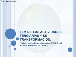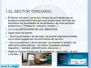 Este documento resume las principales características del sector terciario y las actividades terciarias. Explica que el sector terciario incluye servicios que no producen bienes materiales pero satisfacen las necesidades de las personas. Describe los diferentes tipos de servicios y su localización espacial. También analiza el comercio, los transportes y el turismo, y resume sus características actuales en diferentes países y regiones.