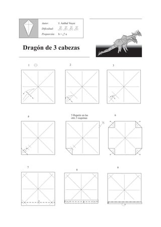 Este documento proporciona instrucciones paso a paso para plegar un dragón de 3 cabezas. Las instrucciones incluyen 30 pasos para plegar las cabezas y la cola del dragón, así como pliegues adicionales en las puntas y lados del cuerpo. El objetivo final es crear un dragón tridimensional con 3 cabezas y una cola única.