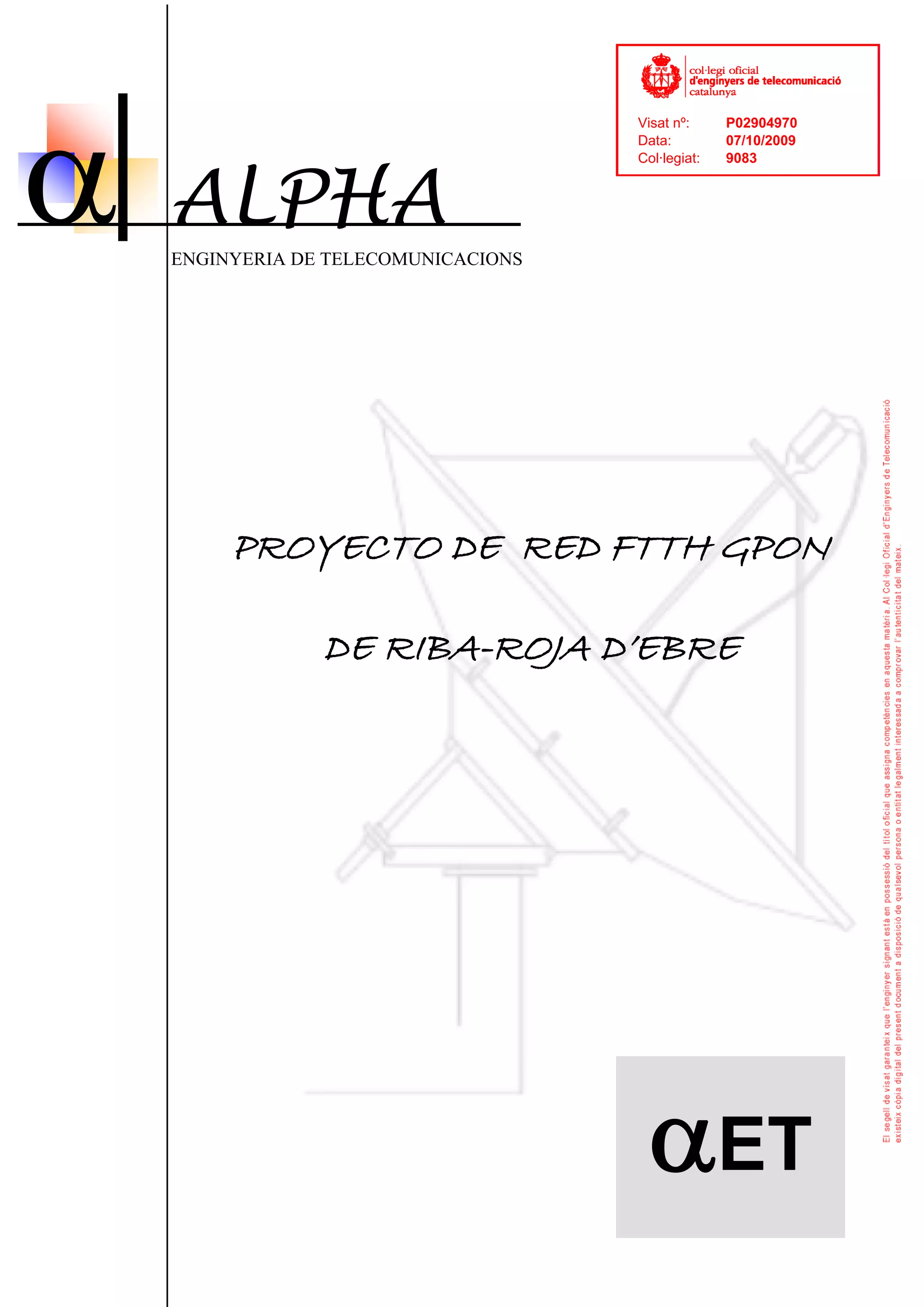 Este documento presenta un proyecto de red FTTH/GPON para el municipio de Riba-roja d'Ebre. El proyecto incluye la instalación de una red de fibra óptica hasta el hogar que proveerá servicios de televisión, internet y telefonía a 833 viviendas. La red consistirá en un centro de datos en el ayuntamiento, una red de distribución exterior con armarios de cableado y acometidas a los hogares. El objetivo es proveer una plataforma de telecomunicaciones de alta capacidad y bajo