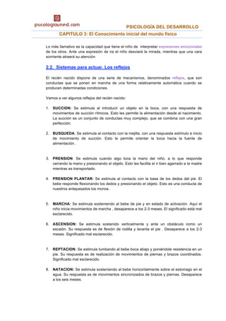El documento describe las capacidades cognitivas y perceptivas de los recién nacidos. Explica que los bebés pueden percibir estímulos visuales, auditivos y táctiles desde el nacimiento. También tienen varios reflejos que les permiten succionar, agarrar objetos y moverse. Con el tiempo, mejoran su visión y atención a las caras humanas. También desarrollan la imitación, lo que sugiere su capacidad de representación mental.