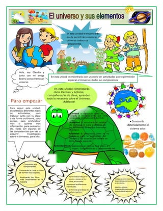 El documento presenta información sobre el Universo y sus componentes. Introduce a Claudia y Beatriz, quienes van a aprender sobre el Universo a través de diversas actividades. Estas actividades incluyen definir qué es el Universo, estudiar la Luna, la conquista del espacio y el sistema solar.
