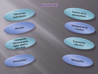 Este documento trata sobre las diferencias individuales en el contexto educativo. Describe tres enfoques para entender las diferencias individuales (estático, situacional, interaccionista) y cinco métodos generales utilizados en el tratamiento educativo de las diferencias individuales, incluyendo métodos selectivos, de flexibilidad, de neutralización y de adaptación de objetivos. Además, discute factores de la personalidad como fuente de diferencias individuales.