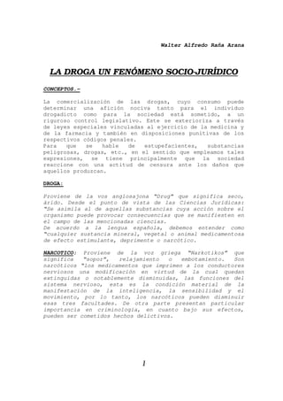 El documento trata sobre las drogas como un fenómeno socio-jurídico. Explica conceptos clave como droga, narcótico y narcotráfico. También analiza factores sociales que inciden en la actividad ilícita de las drogas como la pobreza, la sobrepoblación urbana, y la falta de oportunidades laborales. El derecho juega un papel importante en la regulación del narcotráfico como un fenómeno social dinámico que afecta a todas las sociedades.