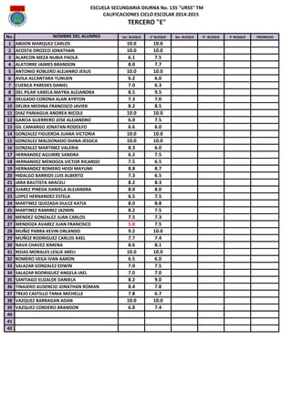 Este documento presenta las calificaciones de 42 estudiantes de tercero de secundaria en 5 bloques diferentes así como su promedio general. Incluye el nombre de cada estudiante y sus calificaciones numéricas por bloque de 6 a 10 puntos. Algunos estudiantes obtuvieron calificaciones perfectas de 10 en todos los bloques.