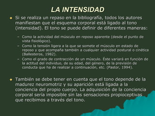 Este documento describe los elementos fundamentales de la expresión corporal, incluyendo la intensidad, el espacio y el tiempo. Explica que el movimiento corporal responde a estímulos de manera espontánea y puede transmitir significado a través de gestos y posturas. Además, clasifica diferentes tipos de tareas de expresión corporal y contenidos para llegar a la dramatización.