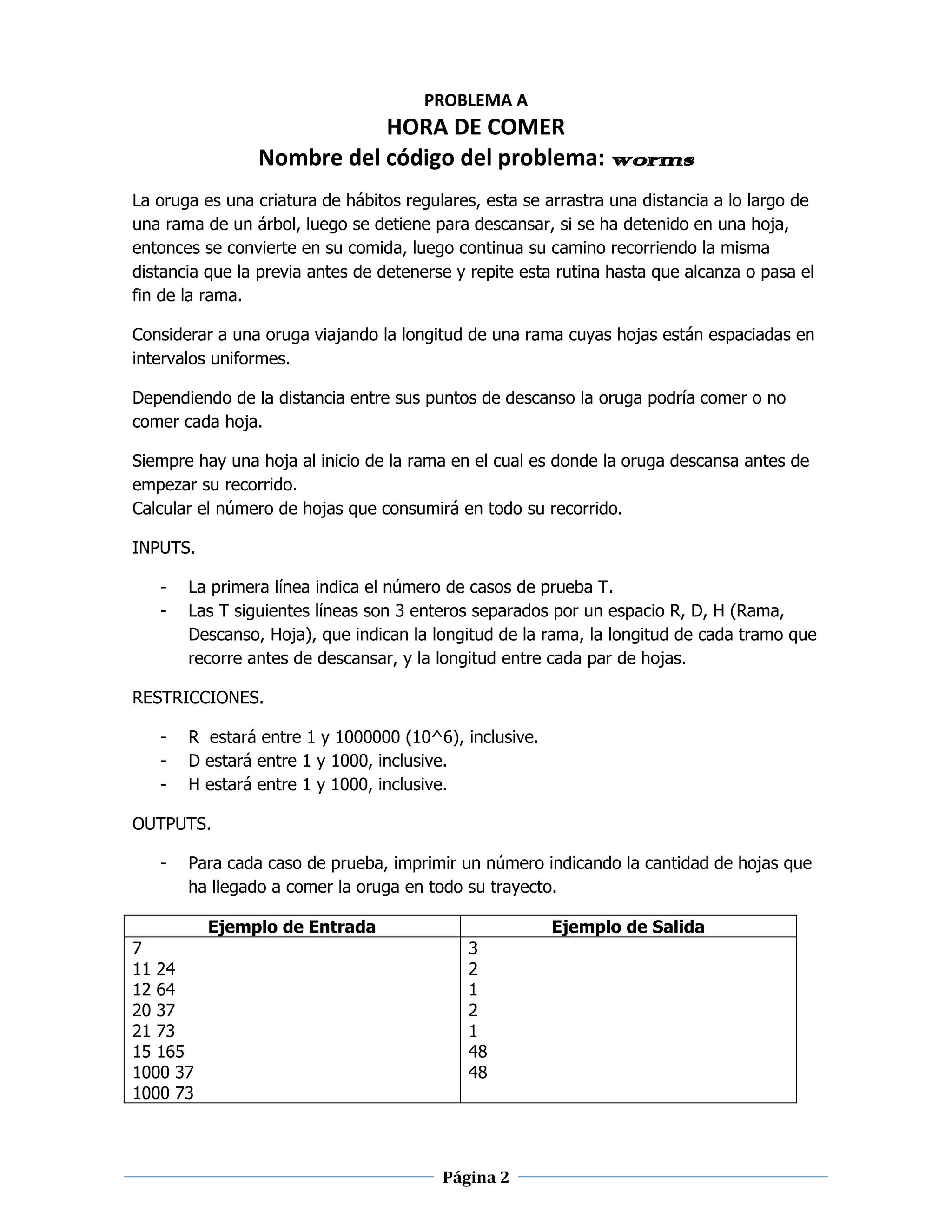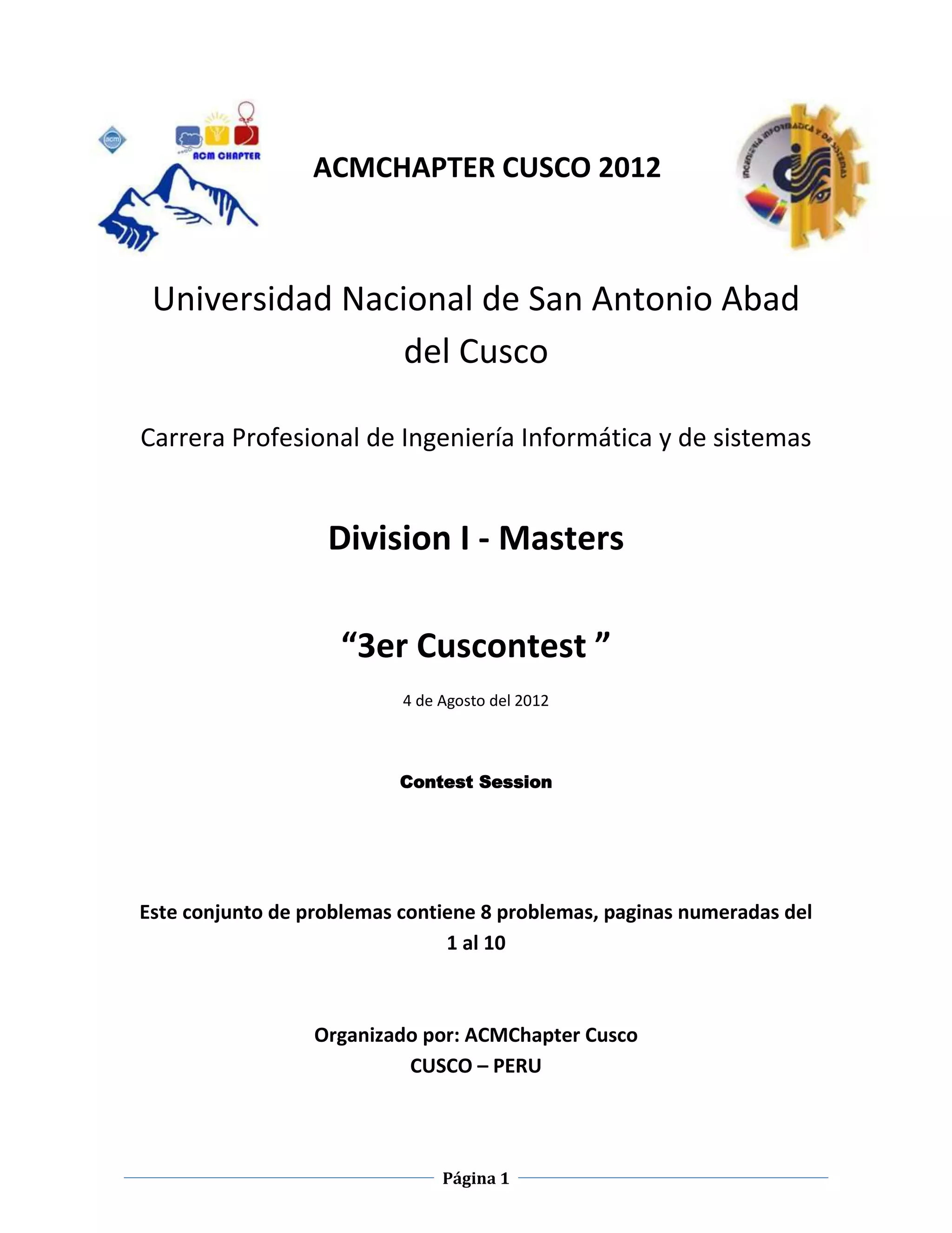 Este documento presenta 8 problemas de programación para un concurso organizado por ACMChapter Cusco. Cada problema contiene una descripción del problema, las entradas y salidas esperadas, y posibles restricciones. Los problemas cubren temas como simular el movimiento de una oruga, plegar papel para que quepa en una caja, recorrer una espiral numérica, ordenar estudiantes por tamaño, y determinar si un número es libre de cubos. El documento provee múltiples ejemplos de entradas y salidas para cada problema.