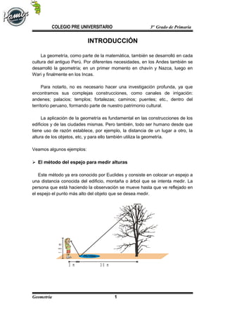 El documento describe la aplicación de la geometría en las antiguas culturas del Perú. Se utilizó la geometría para construir canales de irrigación, andenes, palacios, templos, fortalezas y caminos. También se usó para medir alturas y entender la relación entre el área y volumen de los cuerpos de los animales.