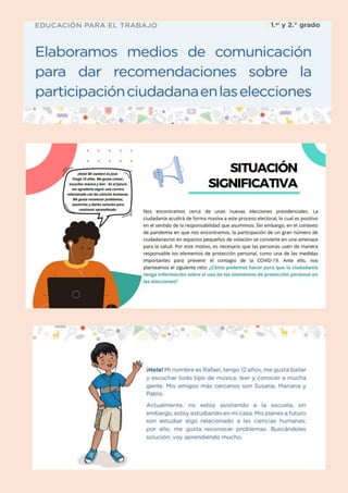 El documento describe cómo formular un reto para un proyecto de diseño de pensamiento. Se recomienda comenzar con la pregunta "cómo" seguida de un verbo para describir el objetivo, como "eliminar", y luego especificar el problema que se abordará, que en este caso es "la desinformación de los ciudadanos en el uso de elementos de protección personal para las elecciones 2021". A continuación, se pide elaborar un medio de comunicación sobre el uso correcto de protección personal para las elecciones y tomar una foto de un familiar usándolos correctamente para enviar por
