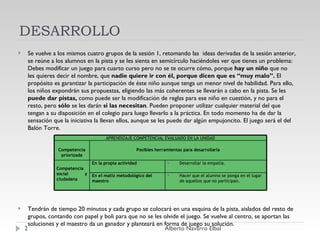 El documento describe una actividad para adaptar juegos para satisfacer las necesidades de todos los estudiantes. Los estudiantes se dividen en grupos para proponer modificaciones al juego "Balón Torre" que garantice la participación de un estudiante con menor habilidad. Los estudiantes deben proponer cambios a las reglas para ese estudiante sin cambiarlas para los demás. El maestro elige la mejor solución y la pone en práctica en la cancha, con el objetivo de desarrollar la empatía y la capacidad de los estudiant