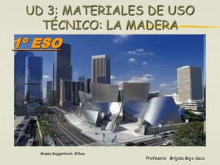 Este documento proporciona información sobre los materiales de uso técnico, con un enfoque en la madera. Explica que los materiales naturales se utilizan como materia prima y que la madera se obtiene de los árboles. Describe el proceso de transformación de la madera, desde la tala hasta los productos finales como el papel, el cartón y los tableros.