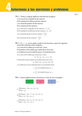 Este documento contiene ejercicios de álgebra que involucran la traducción de enunciados al lenguaje algebraico, la simplificación de expresiones algebraicas como monomios, polinomios y la extracción de factores comunes. Los ejercicios cubren temas como grado de monomios, suma y resta de polinomios, producto de monomios, factorización y más.