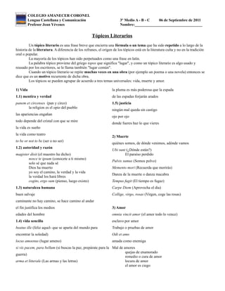 Este documento define un tópico literario como una frase breve que encierra un tema o fórmula repetida a lo largo de la historia de la literatura, a diferencia de los refranes que provienen de la tradición oral. Explica que la mayoría de los tópicos están en latín y su origen es la literatura culta. Además, los agrupa en tres temas universales: vida, muerte y amor, e ilustra cada uno con varios ejemplos de tópicos literarios recurrentes.