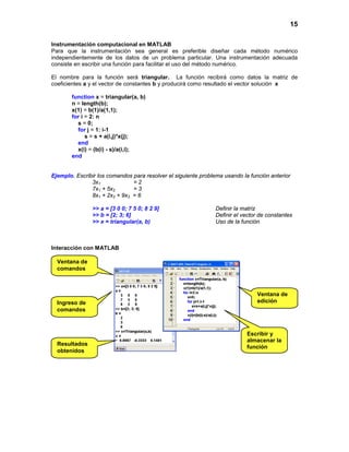 Este documento describe métodos directos para resolver problemas numéricos. Estos métodos involucran una secuencia finita de operaciones aritméticas para obtener resultados exactos. Se provee un ejemplo de un algoritmo para resolver sistemas de ecuaciones lineales triangulares inferiores. Adicionalmente, se discute la eficiencia de los métodos directos y cómo medirla usando la notación O(n) que indica el orden de complejidad de un algoritmo.