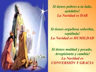 El documento describe el verdadero significado de la Navidad a través de una serie de frases. La Navidad representa gozo, paz, encuentro, dar, humildad, conversión, gracia, luz, perdón y amor. Recuerda que el mejor regalo que se nos dio fue la salvación a través de la muerte de Jesucristo en la cruz. Desea a los lectores las más ricas bendiciones en este tiempo especial en nombre de Jesucristo.