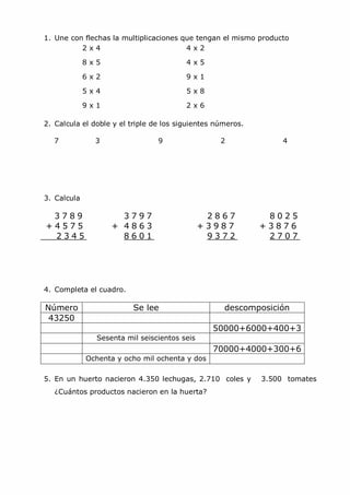 Este documento presenta una serie de problemas matemáticos para realizar durante el verano. Consta de 79 actividades divididas en categorías como suma, resta, multiplicación, división, geometría y medición. El objetivo es practicar diferentes operaciones numéricas y conceptos matemáticos de forma lúdica durante el periodo vacacional.