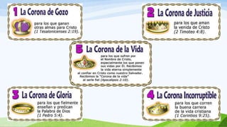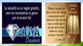 El documento habla sobre la salvación y las recompensas. Explica que la salvación viene por gracia mediante la fe en Cristo, no por obras propias. También discute que los cristianos pueden ganar recompensas en el cielo si viven para servir al Señor, y que serán juzgados por sus obras. Finalmente, enfatiza que Dios desea que los creyentes sepan que son salvos, pueden vencer la tentación, serán perdonados si se arrepienten, y que Dios escucha sus oraciones