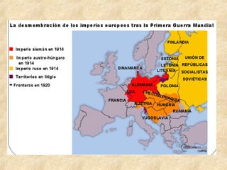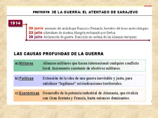 La Primera Guerra Mundial fue un conflicto global entre dos bloques de países aliados que duró de 1914 a 1918. Las potencias europeas como Alemania, Austria-Hungría, Rusia, Francia e Inglaterra se alinearon en dos bandos opuestos y lucharon en varios frentes a través de Europa y más allá. La guerra resultó en millones de muertes y cambió el mapa político de Europa, dando lugar a nuevas naciones y tratados de paz.