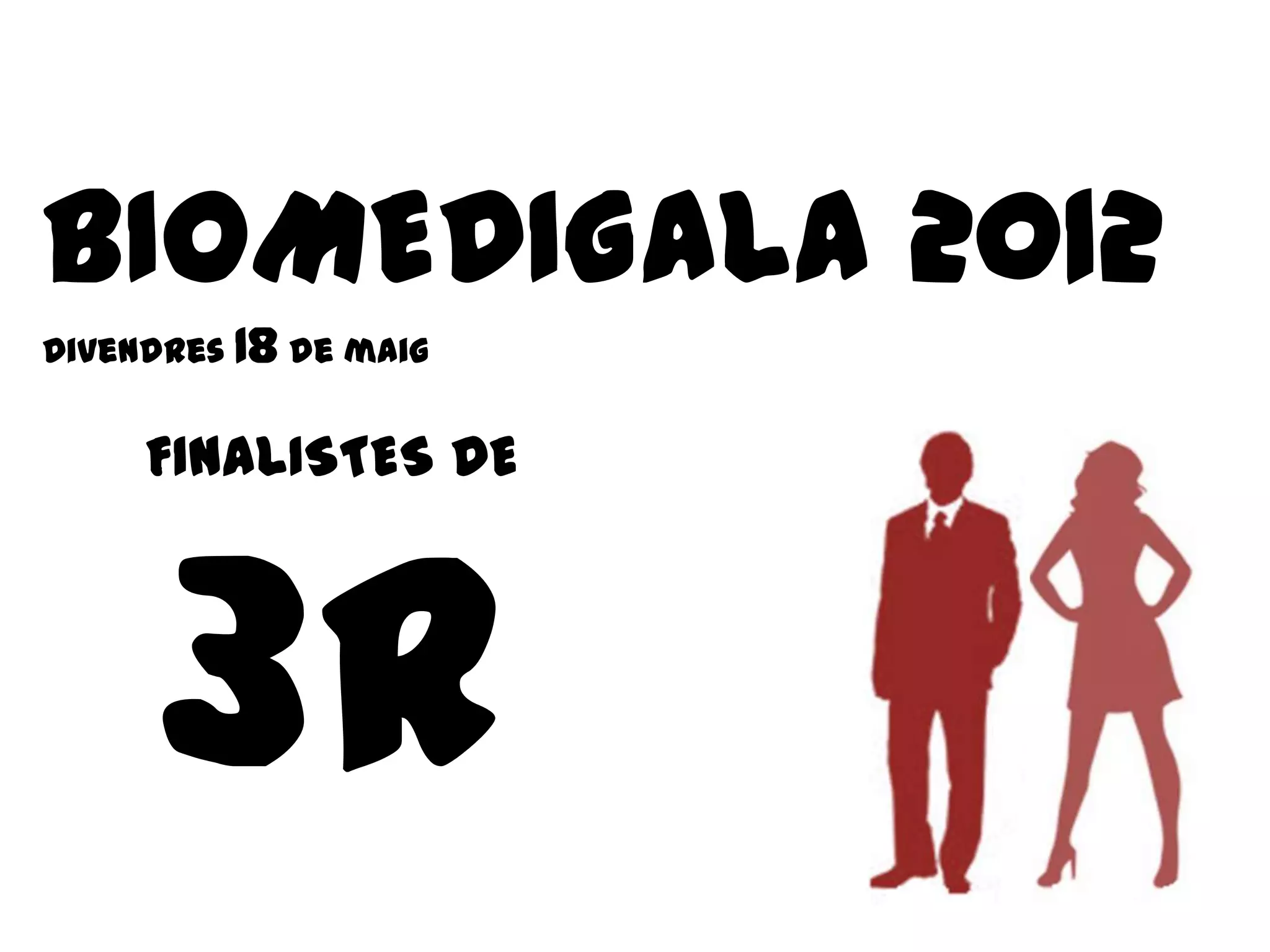 El documento anuncia las categorías de premios que se otorgarán en el evento Biomedigala 2012 el viernes 18 de mayo, incluyendo categorías como Bionovato, Bioveterano, Biomelotiraria, Biomelatiraria, Biolador, Bioetanol, Bioparejita, Biofriki, Fonendo de Oro y Pipeta de Oro, así como una categoría libre.