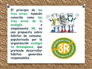 El documento aborda el principio de las tres erres de la ecología (reducir, reutilizar y reciclar) promovido por Greenpeace, que tiene como objetivo minimizar la producción de desechos y mejorar la sostenibilidad en la industria. Se menciona el esfuerzo de Procter & Gamble para reducir residuos y emisiones, así como el éxito de empresas en Bogotá en la implementación de prácticas más amigables con el medio ambiente. Además, se destaca el reciclaje como una alternativa efectiva para disminuir la contaminación y ofrecer oportunidades económicas, con ejemplos de empresas líderes en este ámbito.