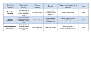 Este documento proporciona información sobre 11 instituciones dedicadas al cuidado de personas de la tercera edad en Tijuana y Mexicali, incluyendo su nombre, misión u objetivos, director o encargado, dirección, contactos y costos. Cada institución ofrece servicios como vivienda, alimentación, vestido y atención médica a ancianos de manera gratuita o con cuotas de recuperación.