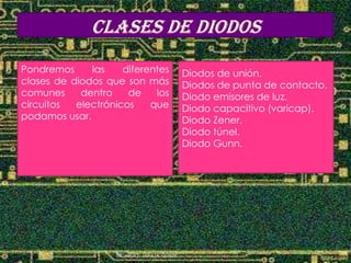 Este documento describe los diferentes tipos de diodos más comunes, incluyendo diodos de unión, diodos de punta de contacto, diodos emisores de luz, diodos capacitivos (varicap), diodos Zener, diodos túnel y diodos Gunn. Explica brevemente las características y usos de cada tipo de diodo.