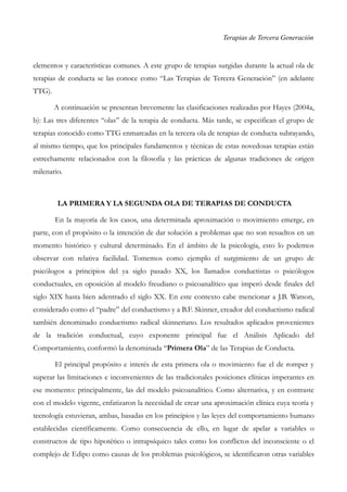 Este documento describe las tres olas de terapias de conducta. La primera ola se centró en el cambio de comportamiento directo a través del condicionamiento y el aprendizaje. La segunda ola incorporó conceptos cognitivos y se centró en cambiar los pensamientos. La tercera ola, conocida como terapias de tercera generación, surgió recientemente y se centra en la flexibilidad psicológica en lugar de la eliminación de pensamientos y emociones.
