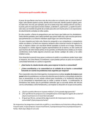 Este documento presenta una serie de actividades para que los estudiantes aprendan sobre su barrio y comunidad. La primera actividad incluye preguntas sobre la historia y el tiempo que han vivido en el barrio. También presenta la historia de Renzo, quien propuso visitar lugares del barrio y encontraron áreas que podrían mejorarse. La segunda actividad incluye un texto sobre la importancia del bienestar comunitario y el sentido de pertenencia. Luego pide a los estudiantes que argumenten sobre la relación entre el bienestar y sentido de