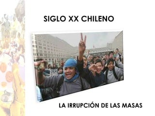 El documento describe el contexto político y económico de Chile en el siglo XX, desde la década de 1920 hasta la década de 1950. Resalta la crisis económica mundial de 1929 y el fin del ciclo salitrero, que provocaron inestabilidad política e impulsaron un nuevo rol del estado como promotor de la industrialización a través de la CORFO y empresas estatales básicas. Los gobiernos radicales entre 1938-1952 consolidaron el estado de bienestar e impulsaron el desarrollo hacia adentro a través de políticas como la