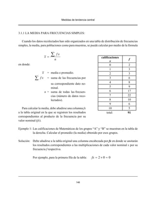 Este documento describe las medidas de tendencia central en Estadística, que incluyen la media, la mediana y la moda. Explica cómo calcular cada una de estas medidas para datos organizados en tablas de frecuencias simples o por intervalos. Para calcular la media, se debe agregar una columna para multiplicar cada valor por su frecuencia. Para calcular la mediana, se agrega una columna de frecuencias acumuladas. La moda es el valor con la frecuencia más alta.