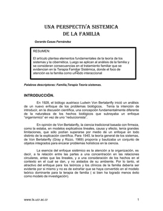El artículo presenta los elementos fundamentales de la teoría de sistemas y la cibernética y cómo se aplican al análisis de la familia. Se considera a la familia como un todo interaccional, dando énfasis a las relaciones entre sus miembros más que a los individuos por separado. La terapia familiar sistémica se enfoca en comprender cómo los problemas y síntomas reflejan la adaptación del sistema familiar completo en un momento dado.