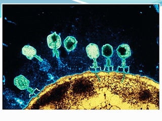 Este documento presenta información sobre diferentes tipos de virus como retrovirus, bacteriófagos y herpesvirus. Explica la estructura de los virus con envoltura y envueltos, así como su ciclo de vida. Se detalla el proceso de infección por retrovirus, incluyendo la transcripción inversa y la integración en el genoma del huésped. También describe brevemente el ciclo de vida del VIH y su mecanismo de acción.