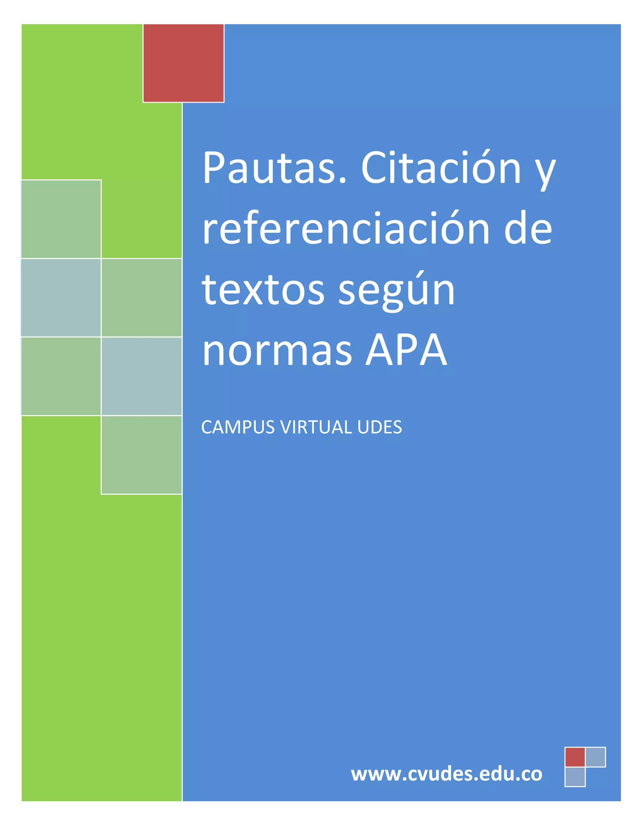 Este documento presenta pautas para citar y referenciar textos de acuerdo con las normas APA. Explica los formatos para citas textuales, de paráfrasis y según la cantidad de autores. También cubre cómo citar autores corporativos, anónimos, fuentes secundarias y cuando la información está incompleta. El objetivo es proveer una guía resumida sobre las normas APA para citas y referencias que deben aplicarse en los textos guía de la Universidad de Santander.