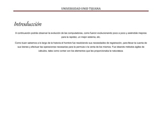 Este documento presenta una línea de tiempo que resume la evolución de las computadoras a través de cinco generaciones, desde las primeras computadoras basadas en tubos de vacío hasta las computadoras personales y supercomputadoras modernas. Cada generación trajo avances como el uso de transistores, circuitos integrados y microprocesadores que hicieron que las computadoras fueran más pequeñas, rápidas y eficientes.