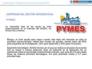 El documento describe el plan estratégico del sector aeronáutico en España, incluyendo tres niveles de ayudas financieras para proyectos de investigación, desarrollo e innovación. La intensidad de las ayudas será del 65%, 35% y 30% respectivamente, y se ajustará adicionalmente de 0.9 a 0.7 dependiendo de si el proyecto se enfoca en áreas de alta, media o baja prioridad tecnológica. La intensidad total de las ayudas podrá estar entre el 30-80% basado en el riesgo