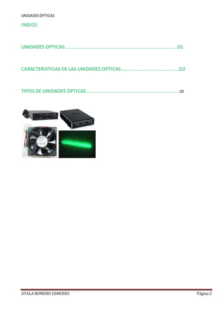 El documento describe las características y tipos de unidades ópticas. Las unidades ópticas almacenan bits mediante tecnologías ópticas que son leídas por un rayo láser. Son medios removibles con gran capacidad de almacenamiento en pequeños espacios y son portátiles y seguros. Existen cuatro tipos principales: unidades CD-ROM, CD-RW, DVD-ROM y DVD-RW.