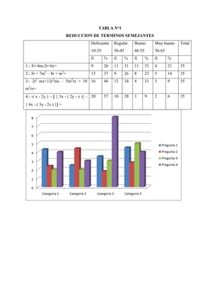 La tabla muestra los resultados de una prueba de reducción de términos semejantes realizada por 35 estudiantes en 4 preguntas. La mayoría de estudiantes tuvieron un desempeño deficiente o regular, con solo unos pocos logrando un desempeño bueno o muy bueno.