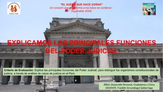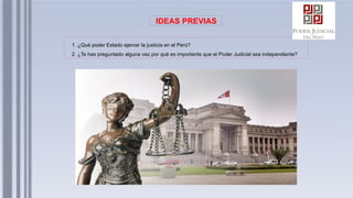El documento describe las funciones del poder judicial en Perú, destacando su independencia y la estructura de sus órganos jurisdiccionales, como la Corte Suprema y los juzgados de paz. Se enfatiza la importancia de la administración de justicia, el papel de los organismos constitucionales, y se presentan ejemplos de situaciones que afectan a los ciudadanos frente a la demora en procesos judiciales. Asimismo, se plantean interrogantes sobre la necesidad de una justicia rápida y eficiente.