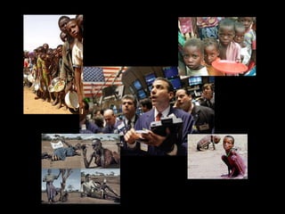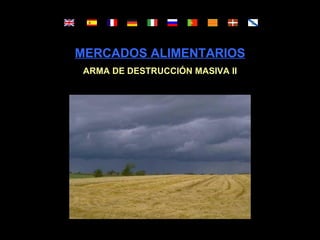 El documento describe la crisis alimentaria mundial actual y sus causas. Múltiples factores como la producción de biocombustibles, el cambio climático, la especulación financiera y las políticas neoliberales han contribuido a elevar drásticamente los precios de los alimentos en todo el mundo, empujando a millones más a la pobreza y el hambre. Expertos critican que la globalización económica ha socavado la soberanía alimentaria de los países y favorecido el control de las multinacionales sobre la producción y distribución de al