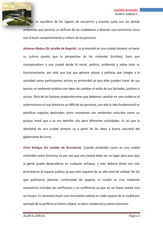 Este documento resume las opiniones de cuatro ex alcaldes sobre el desarrollo de sus ciudades. Jaime Lerner de Curitiba enfatizó la importancia de la sostenibilidad, movilidad y participación ciudadana. Xerardo Estévez de Santiago de Compostela destacó la rehabilitación del patrimonio y la creación de espacios de encuentro. Antanas Mokus de Bogotá se enfocó en la cultura e integración de la sociedad. Finalmente, Oriol Bohigas de Barcelona resaltó la importancia de la calidad del espacio público
