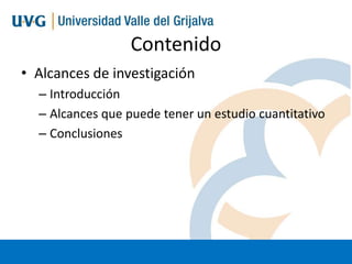 El documento describe los diferentes alcances que puede tener un estudio cuantitativo, incluyendo exploratorio, descriptivo, correlacional y explicativo. Explica que el alcance de un estudio depende de los objetivos del investigador y del conocimiento actual sobre el tema. Los estudios exploratorios examinan temas poco estudiados, los descriptivos especifican características de un fenómeno, los correlacionales asocian variables de manera predecible, y los explicativos intentan establecer las causas de los eventos estudiados. Un estudio puede incluir elementos