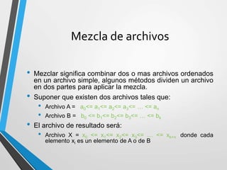 El documento describe varios métodos de ordenamiento externos como la mezcla de archivos, la mezcla por intercalación y la mezcla directa. La mezcla por intercalación combina dos archivos ordenados leyendo un registro de cada uno y almacenando el menor en un archivo de resultados, repitiendo el proceso hasta completar ambos archivos. La mezcla directa realiza particiones y fusiones sucesivas que producen secuencias ordenadas de mayor longitud hasta completar el archivo. La mezcla natural es una optimización de la mezcla directa donde las particiones son de