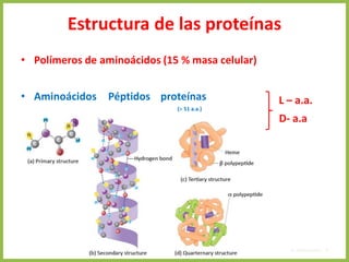 El documento describe las características estructurales y químicas de los aminoácidos. Explica que los aminoácidos son los bloques de construcción de las proteínas y están formados por un carbono alfa unido a un grupo carboxilo, un grupo amino y una cadena lateral variable. Los aminoácidos existen como estereoisómeros L y D, pero solo los aminoácidos L se incorporan a las proteínas. También clasifica los aminoácidos en cuatro grupos basados en las propiedades de sus cadenas laterales y explica conceptos como el