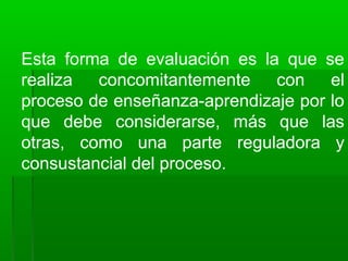 La evaluación formativa se realiza durante el proceso de enseñanza-aprendizaje para regularlo y mejorarlo. Tiene como propósitos averiguar si se están alcanzando los objetivos, tomar decisiones para mejorar el desempeño de los estudiantes, y supervisar su proceso de aprendizaje. Involucra retroalimentar a los estudiantes, enfatizar los contenidos más importantes, y determinar los próximos pasos del aprendizaje. Se puede implementar de forma interactiva, retroactiva o proactiva.